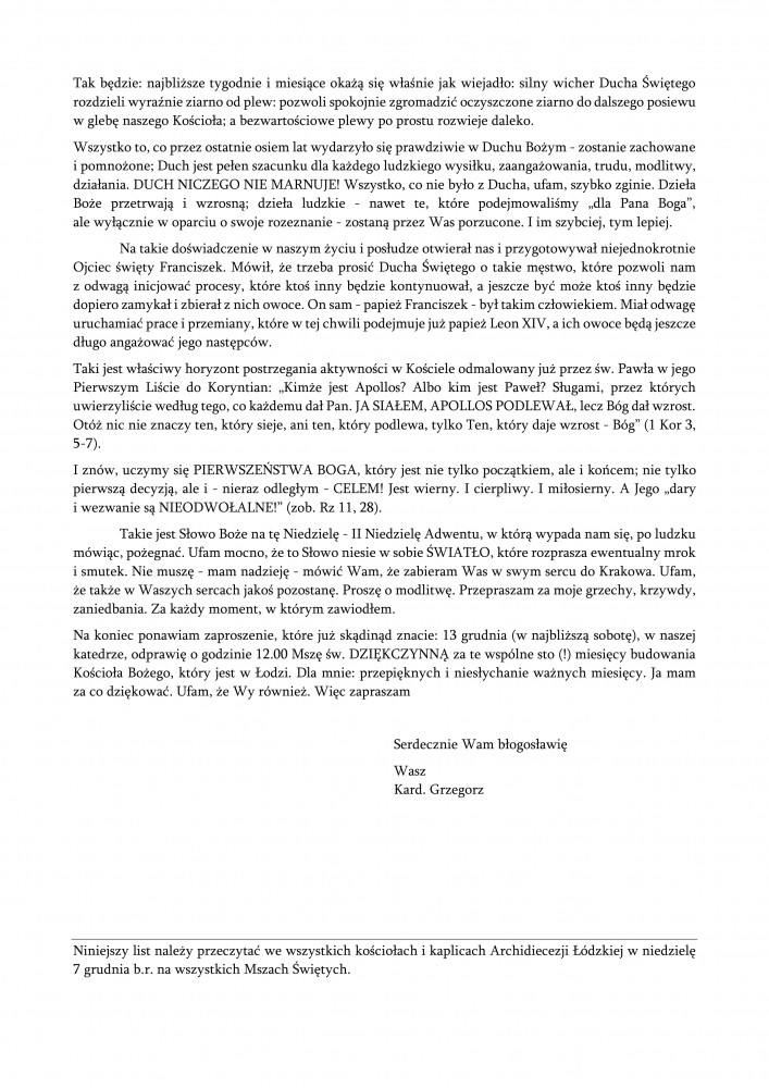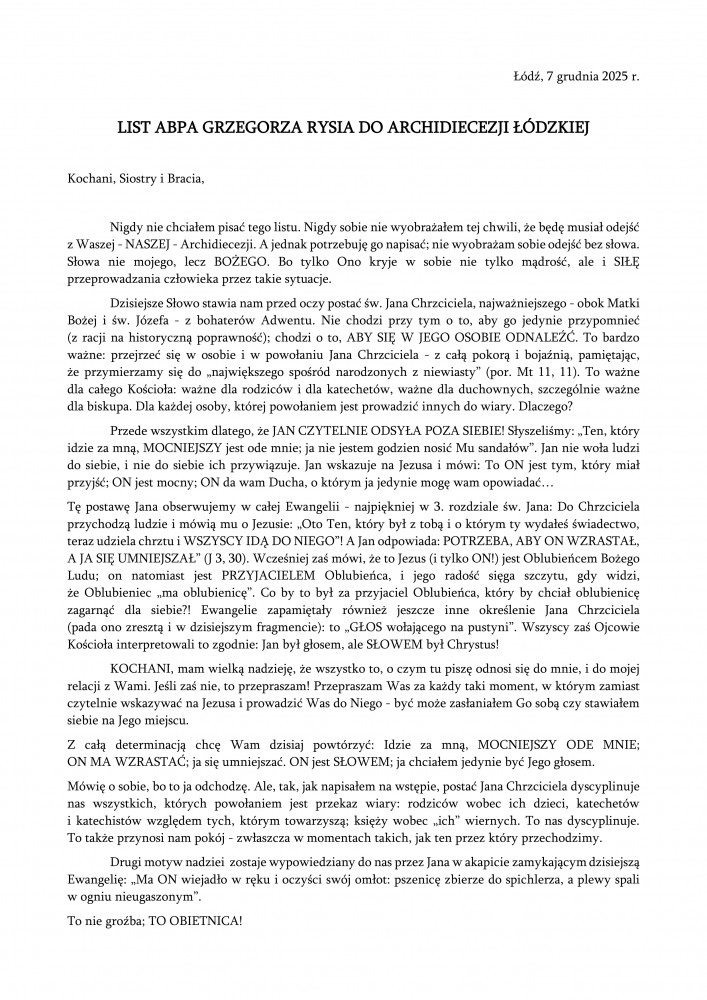 LIST ABPA GRZEGORZA RYSIA DO ARCHIDIECEZJI ŁÓDZKIEJ